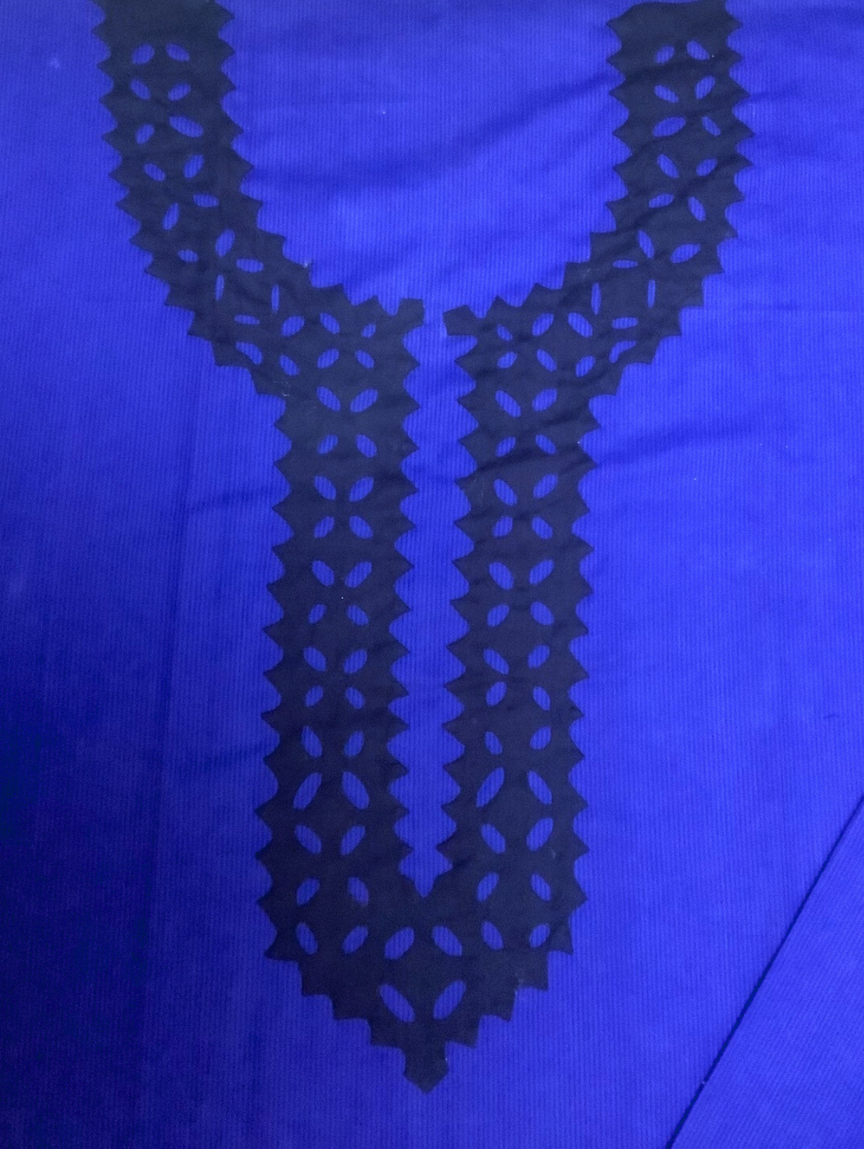 - Color: Navy Blue base with bold black applique accents.