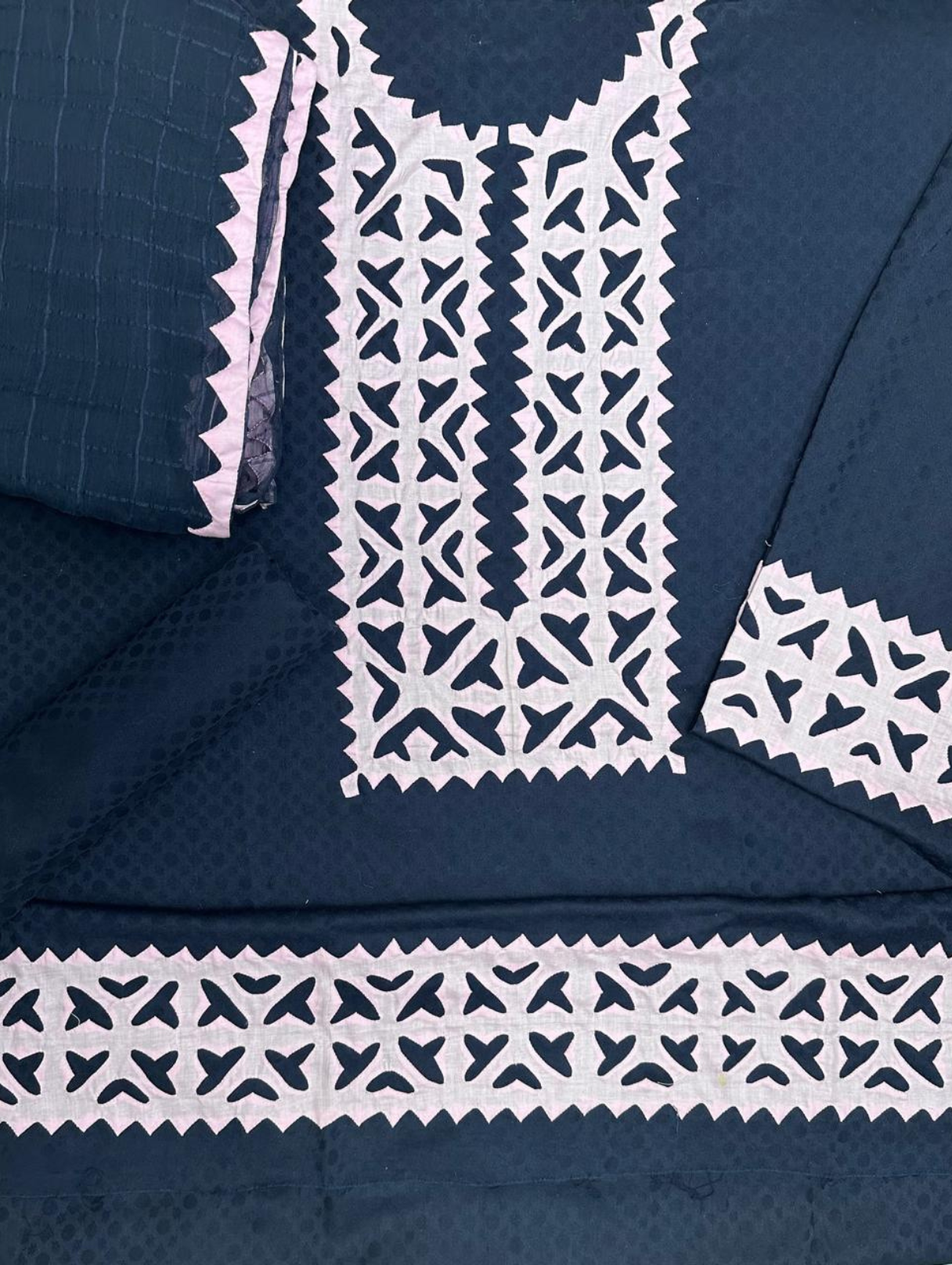 "Starlit Garden" Embrace the magic of twilight with this Navy Blue & Pink Appliqué Set, where deep oceanic hues meet blooming floral motifs. The bold pink appliqué on the neck, sleeves, and hem evokes a garden under moonlight, while the four-sided appliqué dupatta adds a frame of elegance, perfect for: Bridal Events: Ideal for Mehndi or Walima ceremonies. Festive Galas: Pair with silver jewelry for Eid or Diwali celebrations. Cultural Gatherings: Stand out at family functions or community events. Why This Set Captivates: ✨ Artisan Craftsmanship: Each appliqué motif is hand-cut and stitched, honoring Sindh’s textile traditions. ✨ Striking Contrast: The navy-pink combo balances drama and delicacy. ✨ Effortless Coordination: The ready-to-wear dupatta eliminates styling hassles. Styling Tips: Daytime: Pair with white linen pants and pearl accessories for garden parties. Evening: Add a zari clutch and kundan jewelry for bridal grandeur.